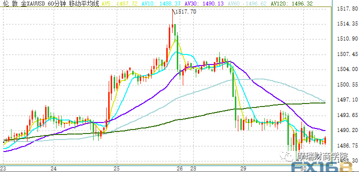 现货黄金周二继续收跌。美市盘中金价出现跳水,盘中最低下探至1483.40美元/盎司,随后金价有所反弹,收在1487.34美元/盎司。